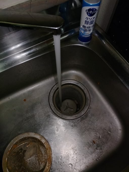さっそく状況を確認すると県営団地の5階でシンクの上に水が溜まってます。