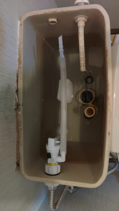 今回はトイレ水漏れのご依頼です。早速お客様のお宅へお伺いし状況をお聞きしましたところ、流していないのにトイレからチョロチョロ音がしているのに気づき、確認してみるとタンクの中から音がしていたとのことでした。タンク内を点検させていただきましたところ、オーバーフロー管から便器側に水漏れを起こしている状況でした。