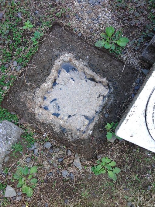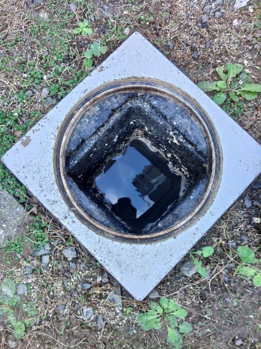 屋外排水詰まりとの事でお伺いしてみると、排水枡から汚水が溢れてきている状況でした。排水管の詰まりですね。