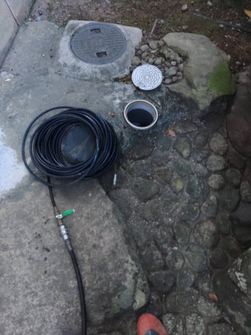 外の配管の点検口を見てみると配管での詰まりでしたので色々ご提案させて頂き、高圧洗浄機を使用して詰まりを除去する作業を即日させて頂きました。