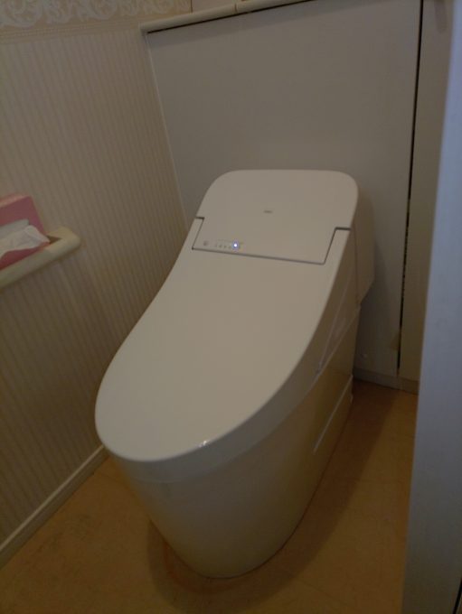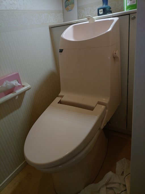新しい便器はオート開閉、オート洗浄の便器です。足元が少し気になるお客様でしたので、これで快適に使って頂けるかと思います。