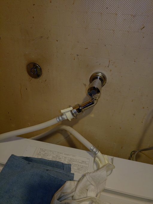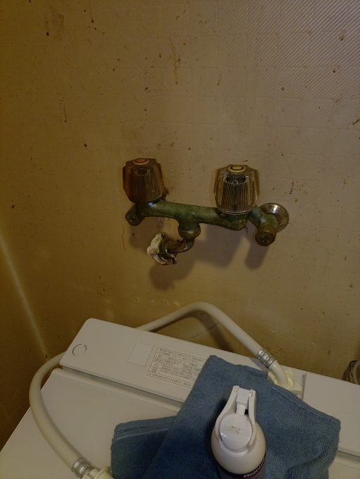 さっそく状況を確認すると洗濯蛇口は珍しい混合水栓が取付けられています。