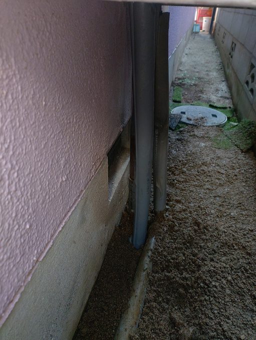 かなり狭い場所ですが鉄管を撤去して、新しい塩ビ管を立ち上げました。