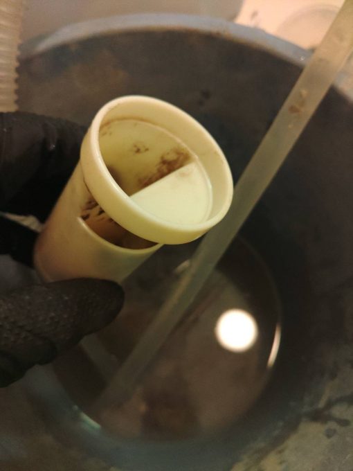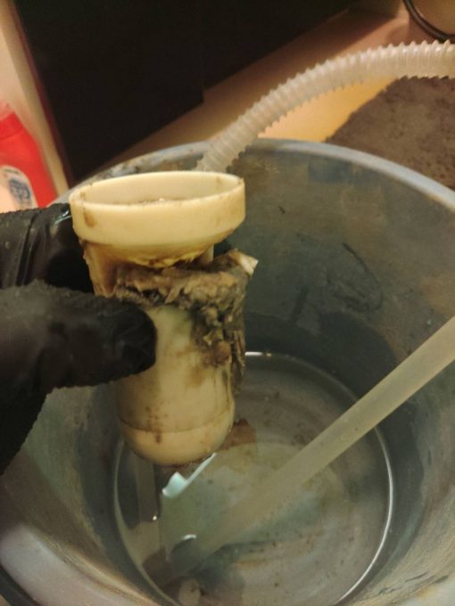 状況からおそらく排水トラップでの詰まりの可能性が高かったので、トラップ分解清掃をご提案してご依頼いただきました。作業させていただくとトラップが埃などの汚れでしっかり詰まっていました。