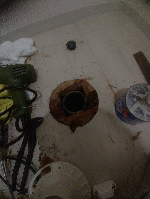 便器を外すと水漏れ箇所はすぐにわかりました。樹脂フランジが割れてしまってます。2年前に便器を交換した時に交換していなかったようです。